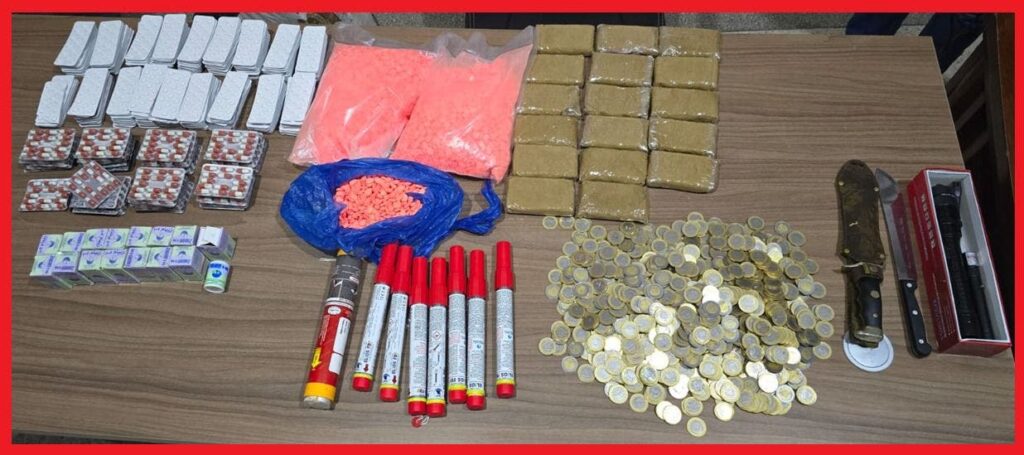 أسفرت عملية التفتيش عن حجز 9412 قرصًا مخدرًا من أنواع مختلفة، بالإضافة إلى كيلوغرام و690 غرامًا من مخدر الشيرا، ومبلغ مالي يُشتبه في كونه من متحصلات النشاط الإجرامي.