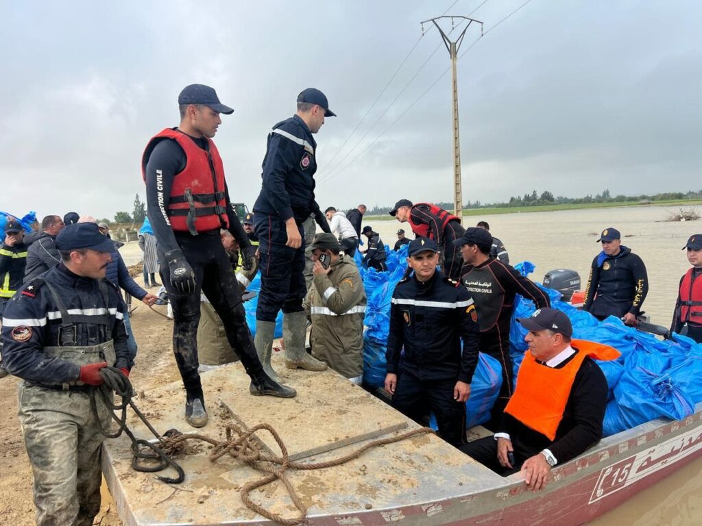 ووصلت المساعدات الإنسانية عبر قوارب تابعة للوقاية المدنية، بعد صعوبة الوصول إلى الدوار بسبب ارتفاع منسوب المياه.