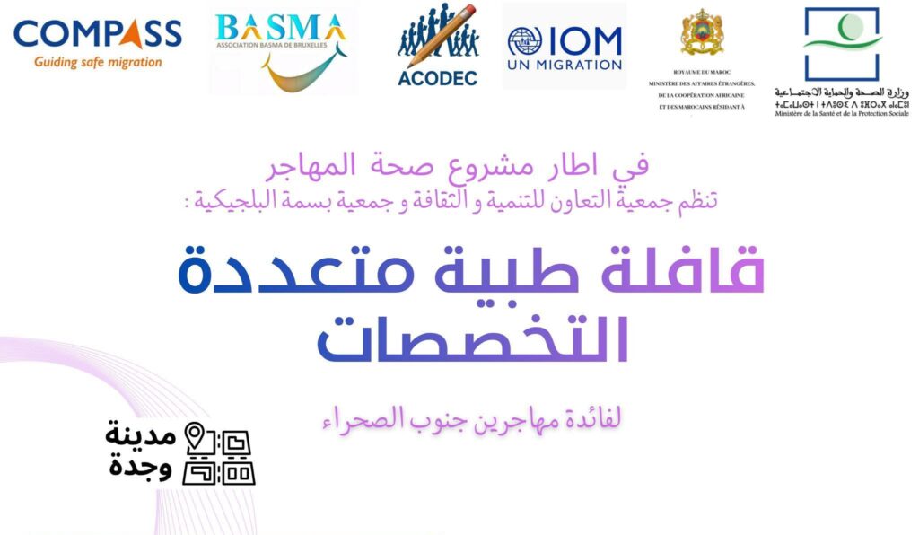 تنظم جمعية التعاون للتنمية والثقافة (ACODEC) وجمعية “بسمة” البلجيكية، قافلة طبية متعددة التخصصات لفائدة المهاجرين من دول جنوب الصحراء بمدينة وجدة، وذلك يوم الأحد 29 مارس الجاري.
