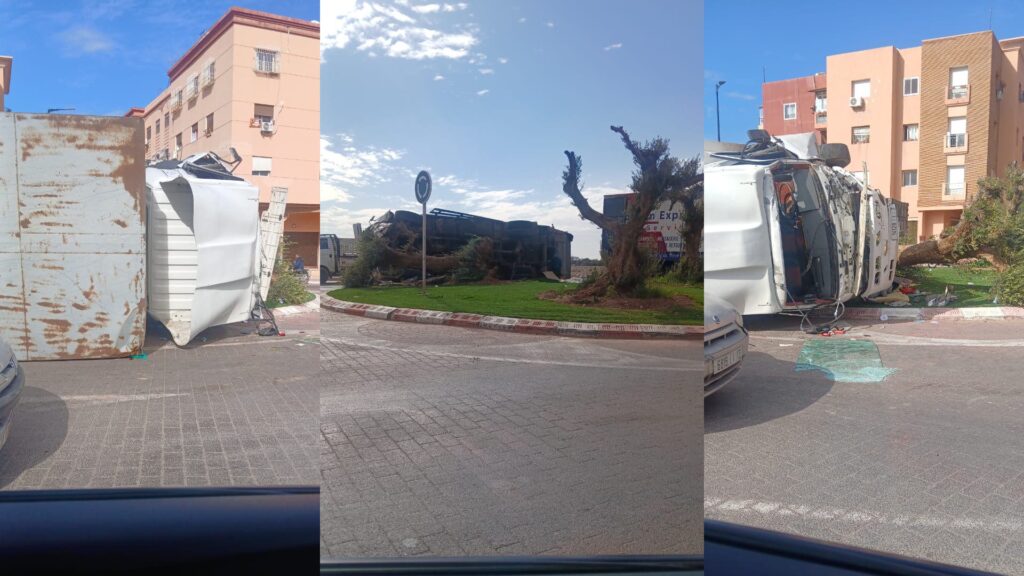 ووفقًا لمصادر مطلعة، وقع الحادث بعد اصطدام الشاحنة بشاحنة أخرى لم تحترم حق الأسبقية، ما أدى إلى انحراف الشاحنة وانقلابها، متسببة في أضرار مادية وإصابة السائق ومرافقه.